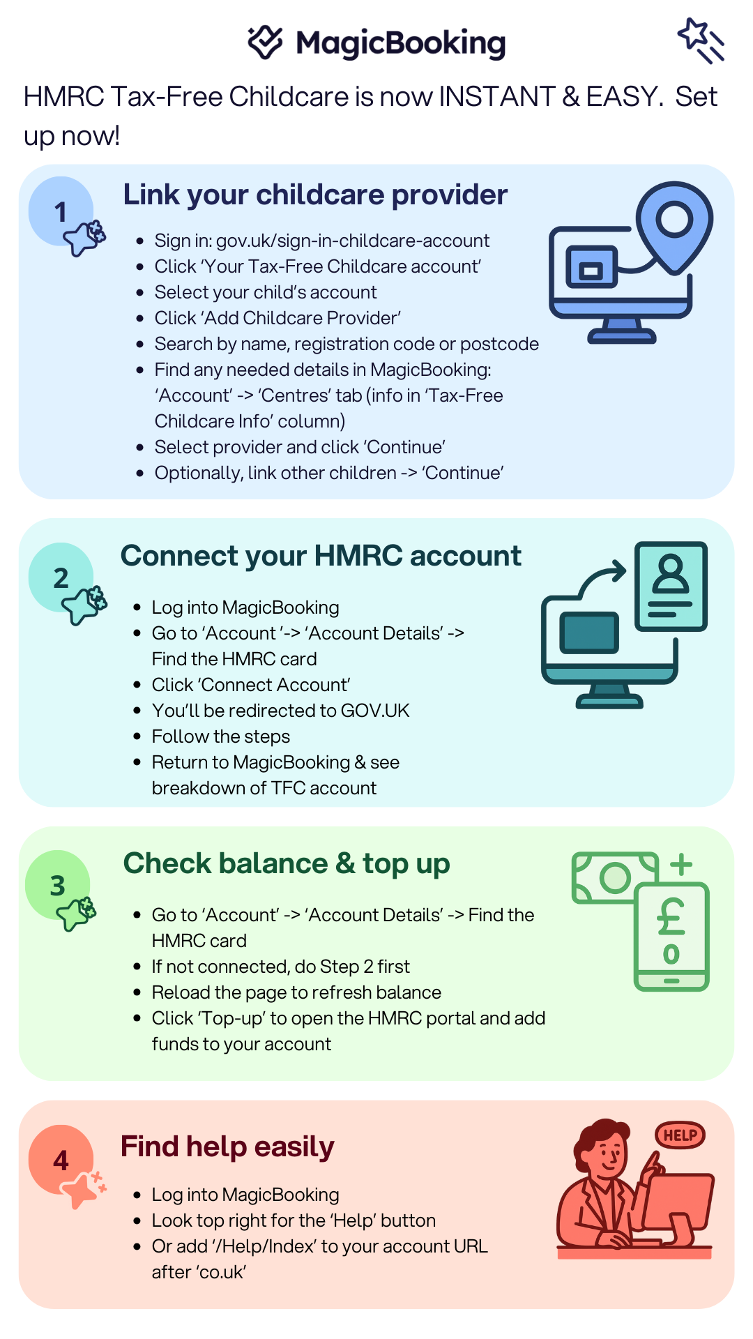 From October 2025 tax-free childcare payments are to be paid through your Magicbooking account. Please see the guidance for how to link your tax-free childcare account to your Magicbooking account here: